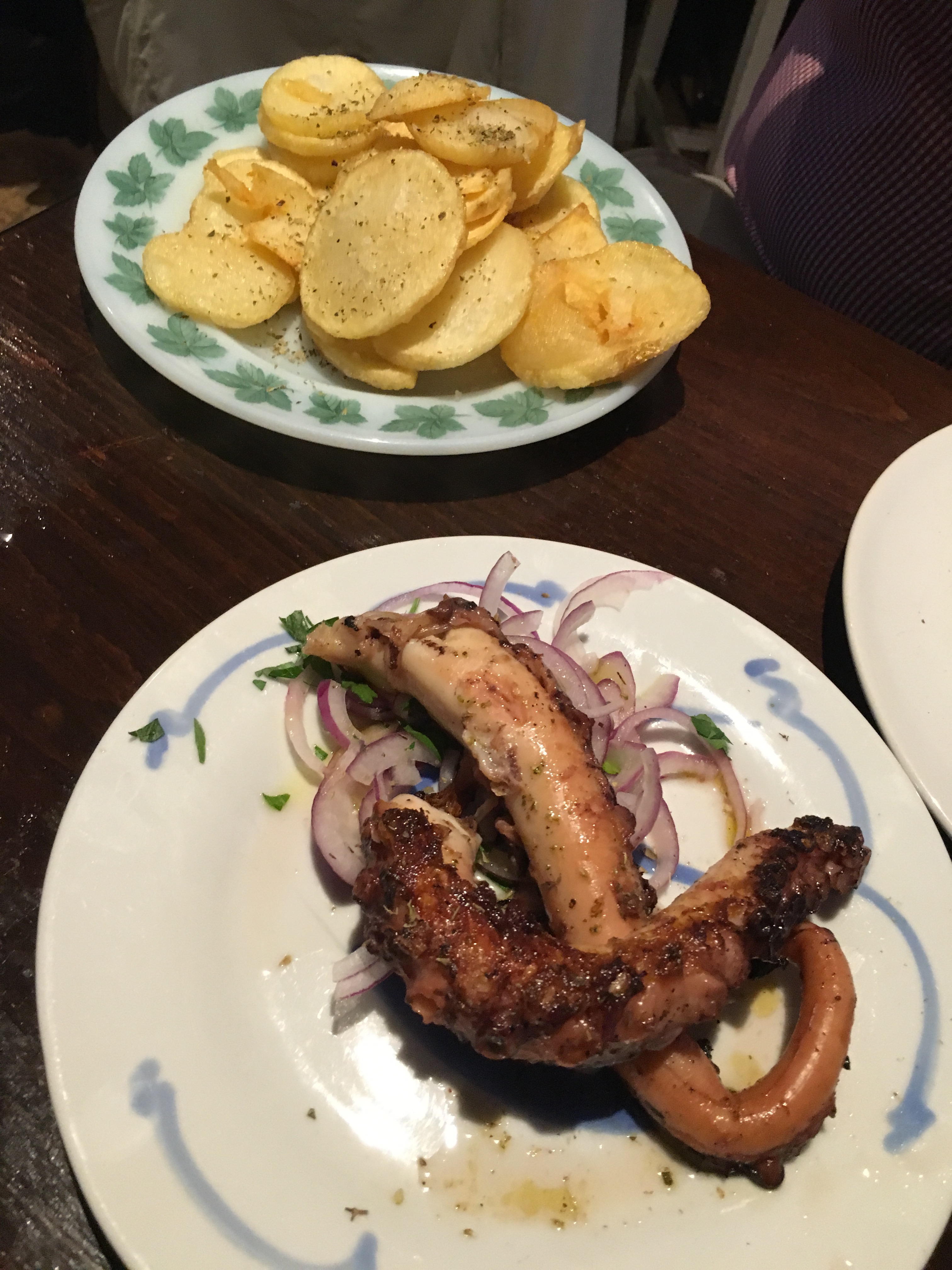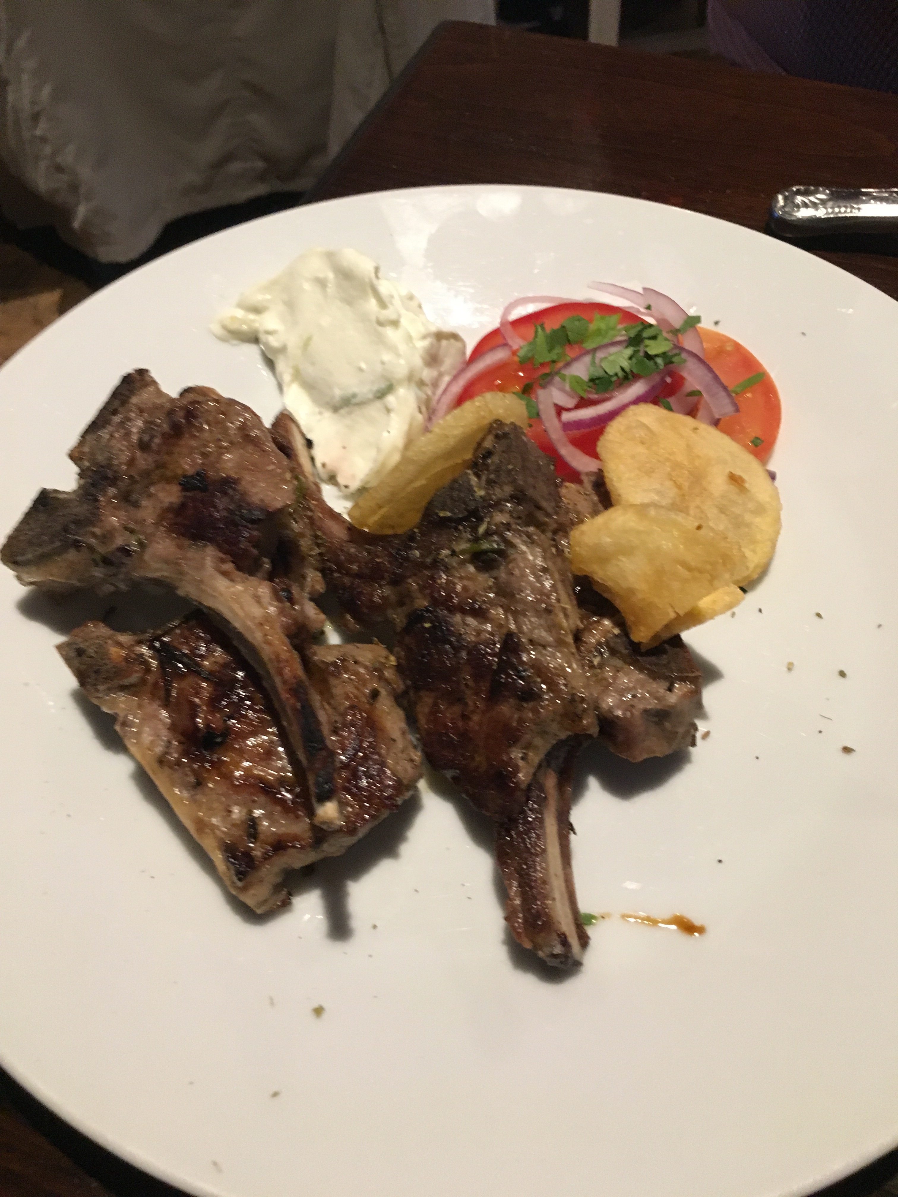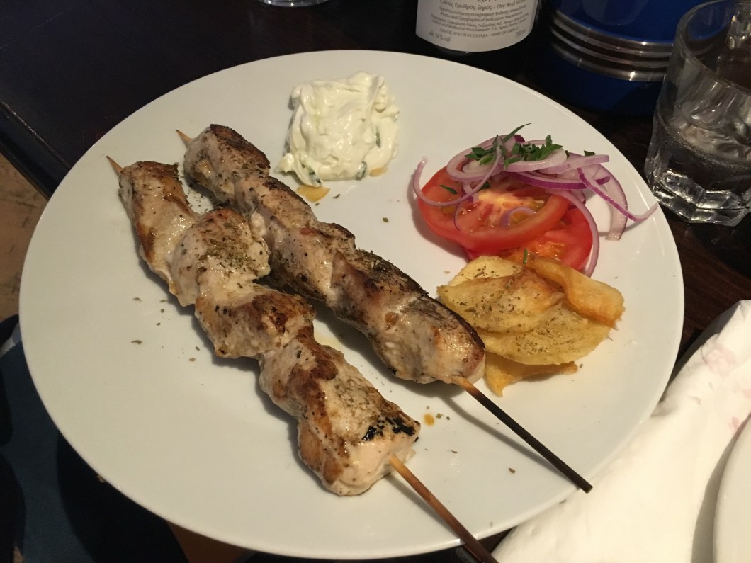 The selection of mezedes was very good, ranging from meat and fish dishes to vegetarian ones. We decided to order some dolmades (one of my favourite dish), a Greek salad (rigorously with feta), fried potatoes, octopus, chicken souvlaki and lamb chops.