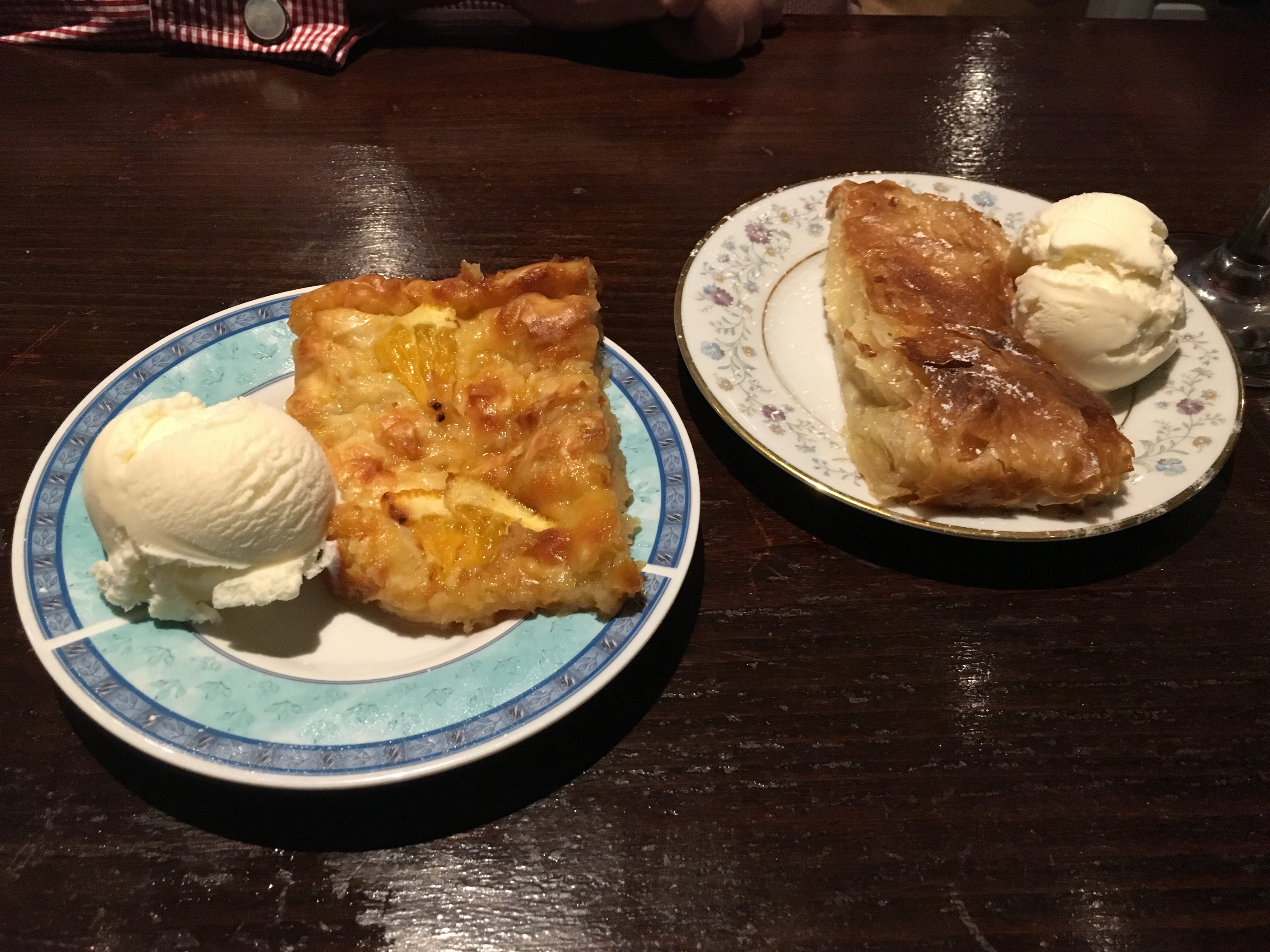 We also had dessert (even I had dessert!) – a slice of Ravani, with orange zest, and a slice of Bougatsa, filo pastry with custard. Both delicious and not overly sweet.