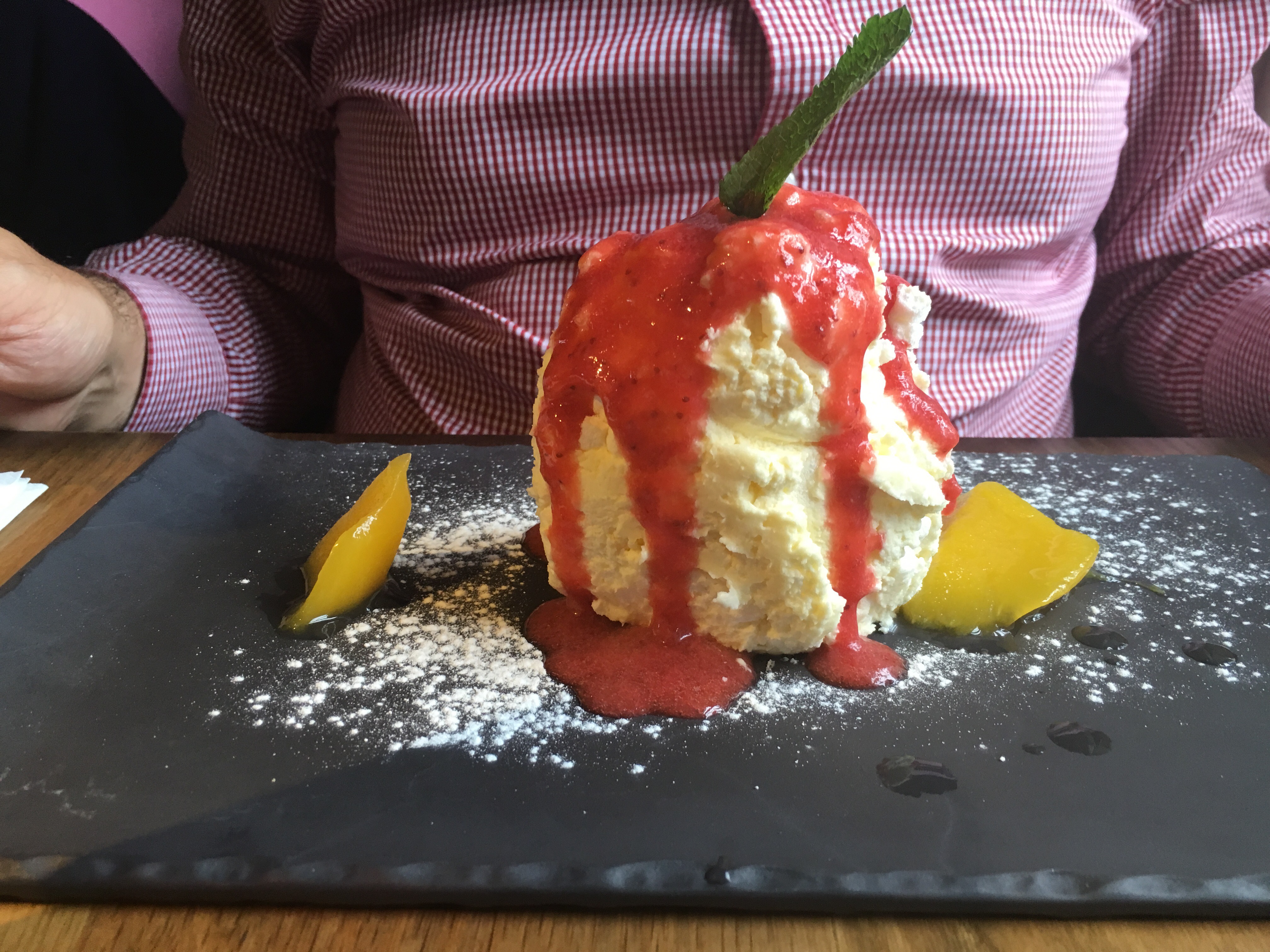 Being still hungry after a long walk around the city and the park, we ordered dessert – a fantastic-looking Eton mess for Robert and a lovely cheese platter for me.
