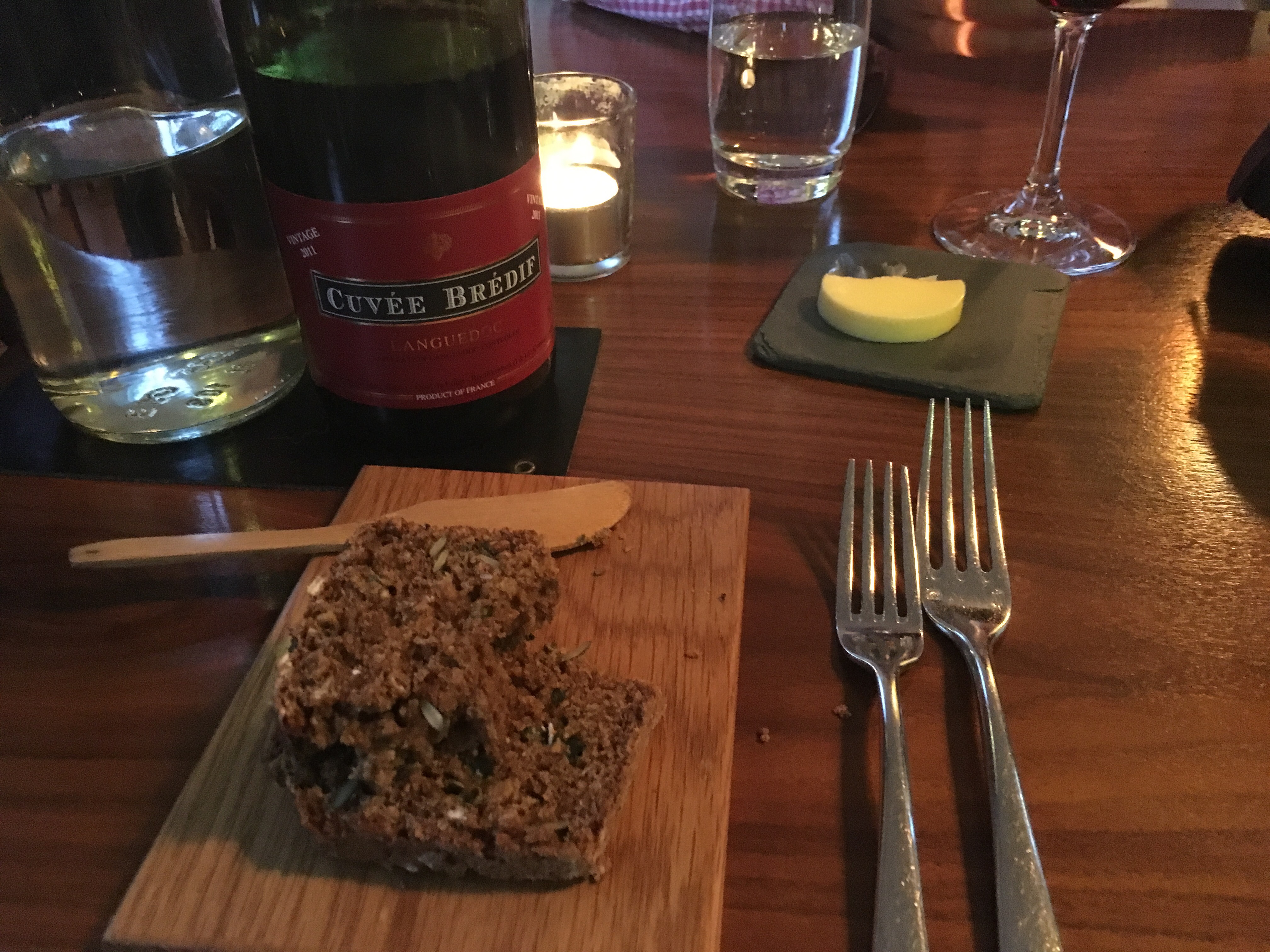 We were shown our table, with a lovely view on College Green that created a romantic atmosphere. We were served a small bread basket with butter (I loved the wooden knife!) and we chose a bottle of 2011 Cuvée Bredif from the long wine list.