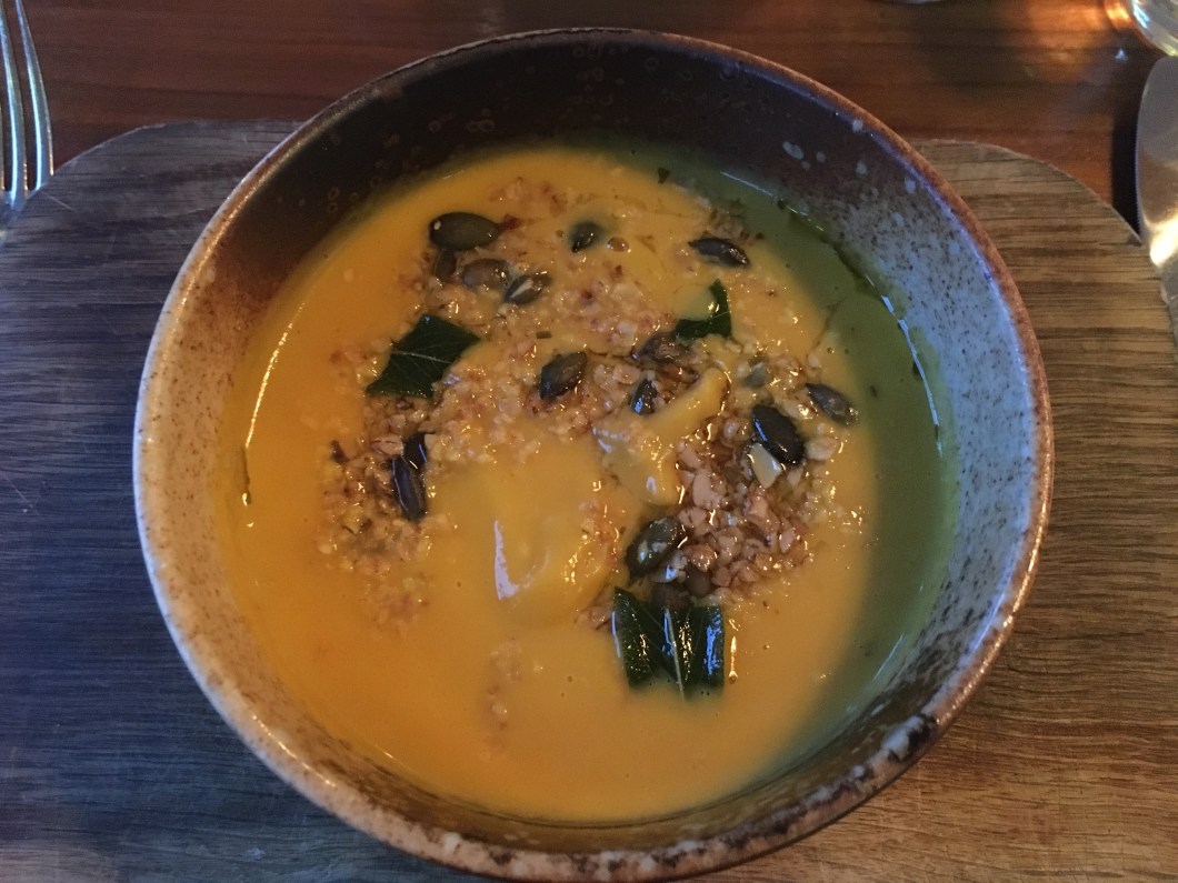 I ordered a creamy summer squash soup with toasted pumpkin seeds and oats. Simply delicious.