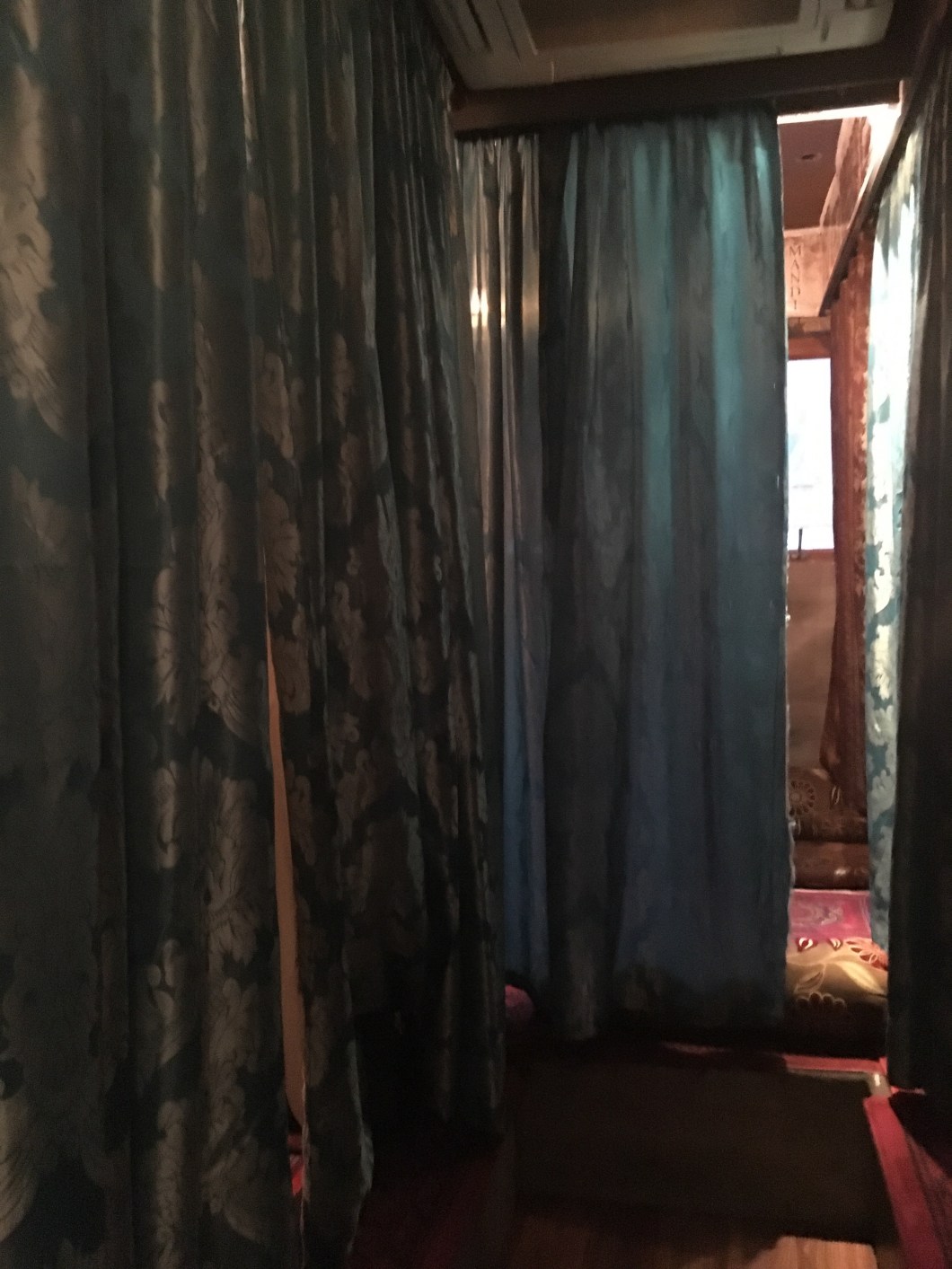 Luckily I was right… The staff showed us the way up a steep staircase to the mysterious ‘upstairs’ area – this was a nicely decorated room consisting of space different in sizes and closed by bright blue curtains. We were shown a small space for two and asked to take our shoes off – we quite happily took our place on the comfortable cushions after a long day of walking around London.