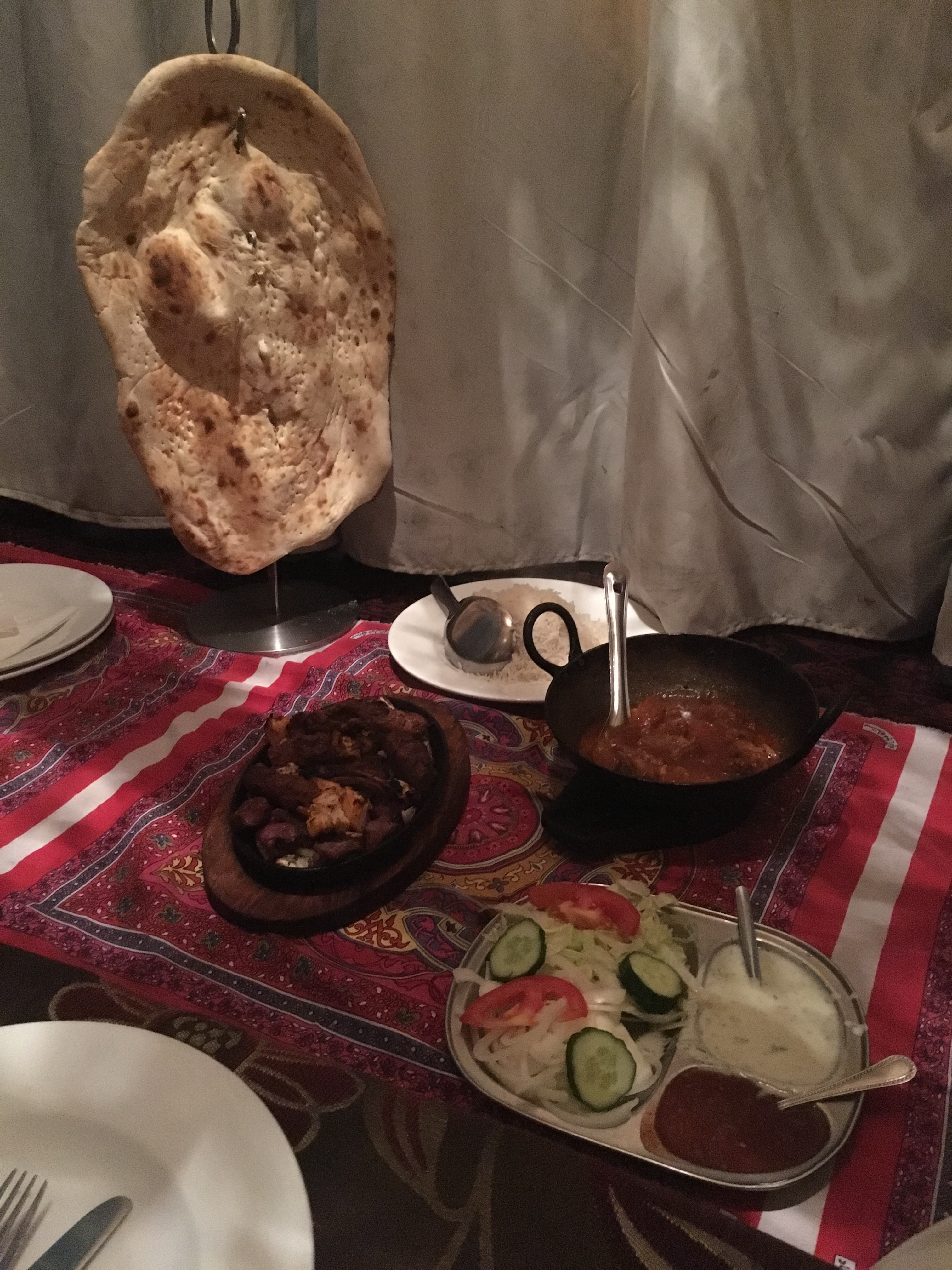 When the food arrived, I have to say that the star of the evening was the naan – lovely salty bread, more similar to pita bread than to the traditional Indian naan (which is much more oily an thinner), hanging from a metal tree. I think I could have eaten all of it and skipped the other dishes.