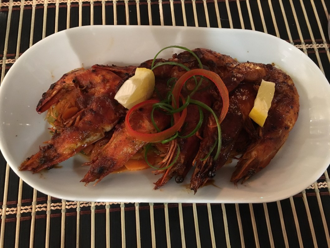 Sadly, there was no Caribbean wine for us to try, so we opted for a bottle of South African Pinotage (2015) – quite pleasant and not too strong, as I was going to take advantage of the fish dishes on offer. A splash of Pinotage complemented very well my starter, jumbo grilled shrimps, cutting through the chilli and the sharpness of the bed of Caribbean vegetables.
