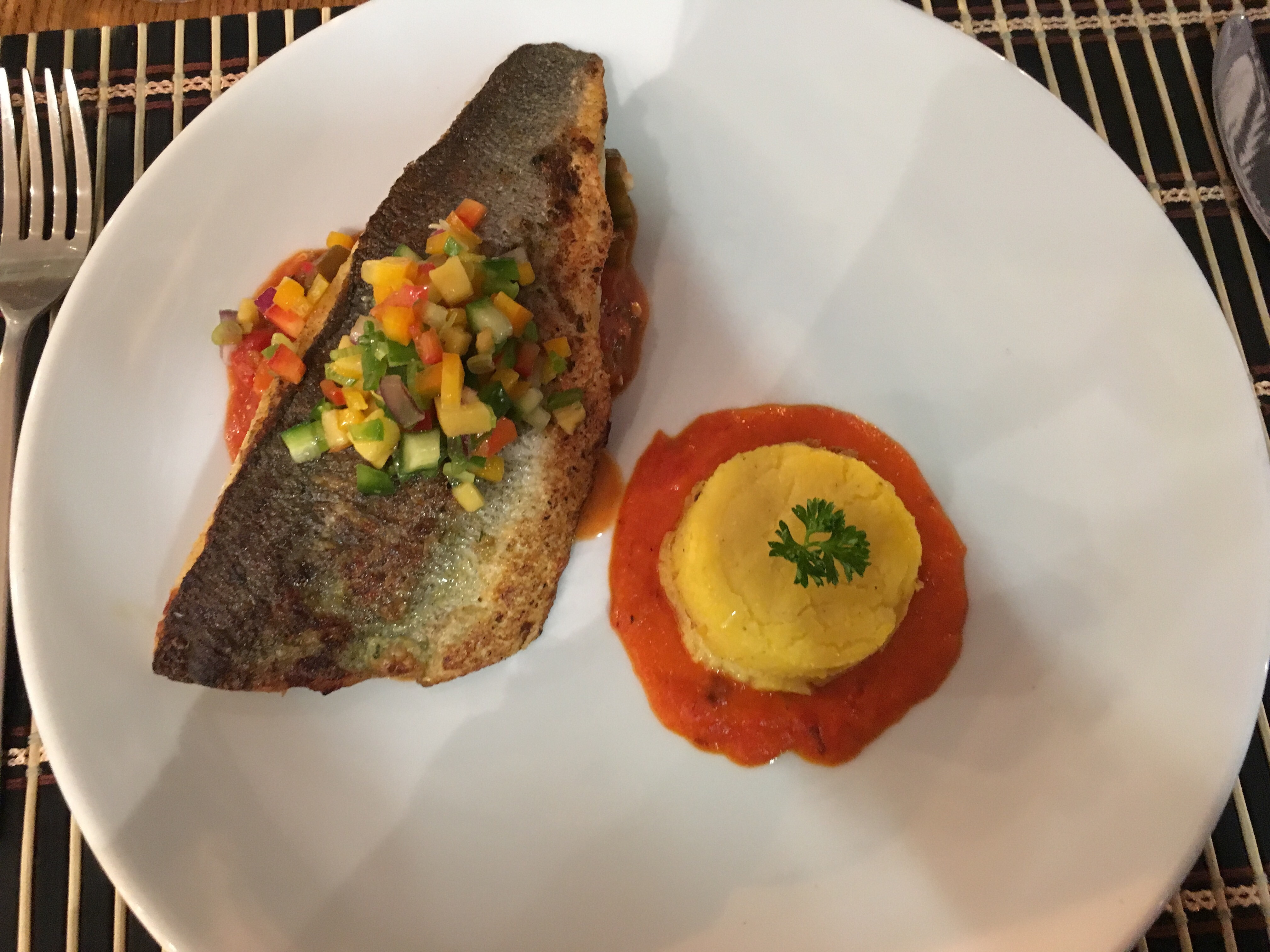 The star of the meal for me was definitely my main course: pan fried sea bream with mango salsa on a bed of okra and mixed vegetables, with polenta cake. When I first read the ingredients, I was not sure they would all work together – how would polenta, which we often associate with warm winter meat stews, complement the mango salsa, the epitome of summer, freshness and lightness?