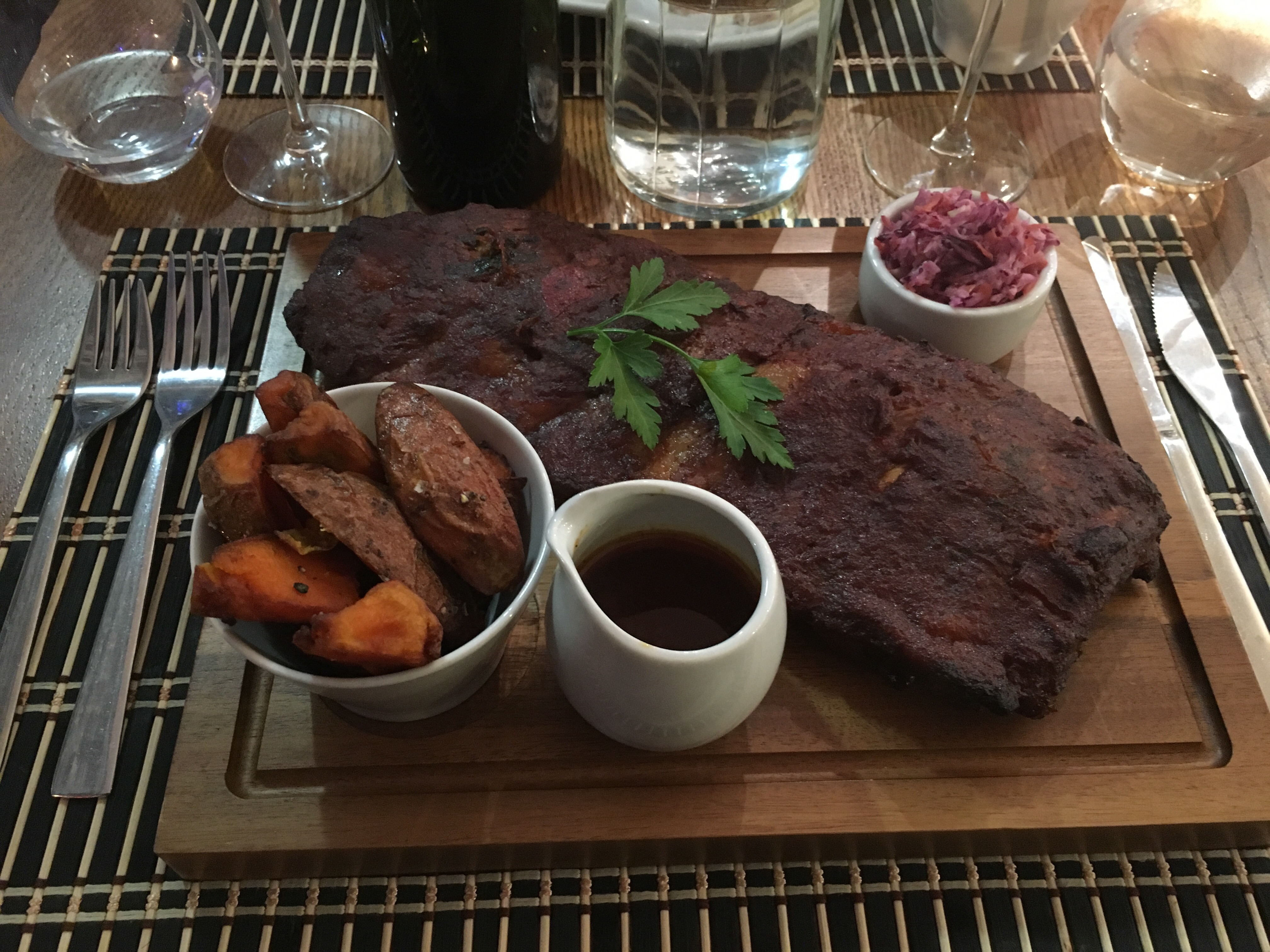 Robert was also very happy with his main: a rather large portion of incredibly soft BBQ ribs. We also had some potatoes, sweet potatoes and plantain (a Caribbean speciality) wedges. I found the plantain wedges a little too dry for my taste, but they were very tasty.